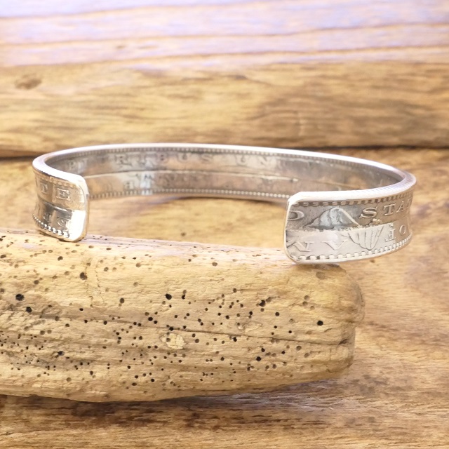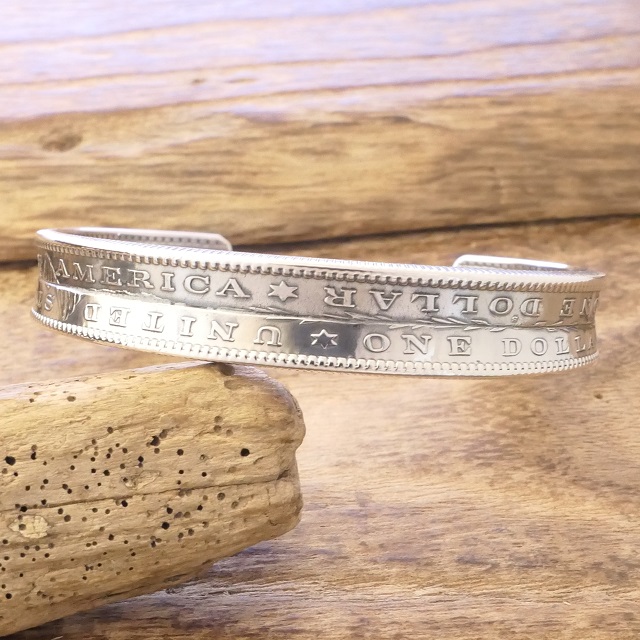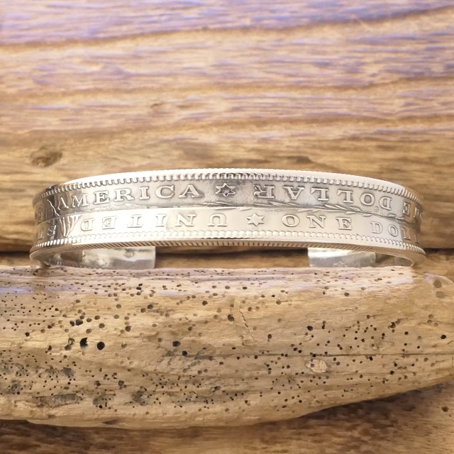 モルガンダラーは、1878〜1904年、1921年にアメリカで発行された有名な1ドル銀貨で、自由の女神像とアメリカの象徴でもある鷲をデザインした、最も代表的なアメリカのコインです。かつてネイティブアメリカン達が銀貨をジュエリーに囲うし始めたのは1800年代、スペイン人がもたらした銀の加工技術は、彼らの独創性により新たな文化を作りだし、1960年代には、ヒッピー達もコインをアートとして加工するようになりました。