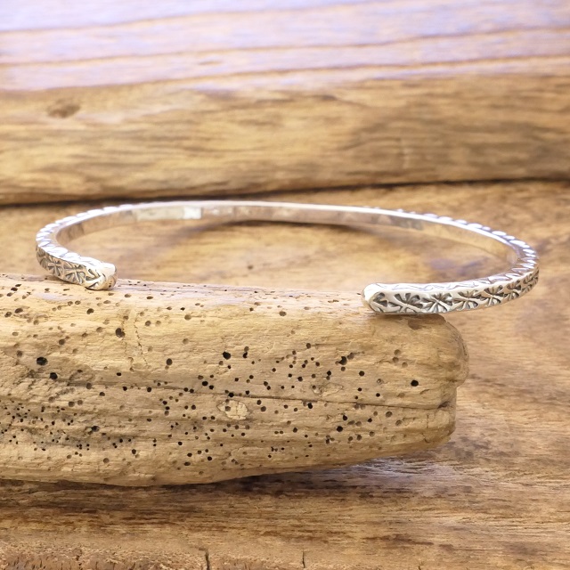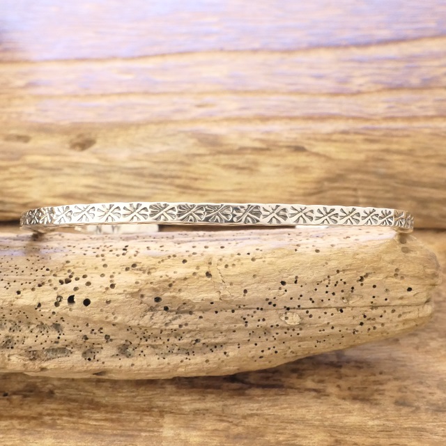 スクエアの地金に3面スタンピングした大変手の込んだ作りのバングル。