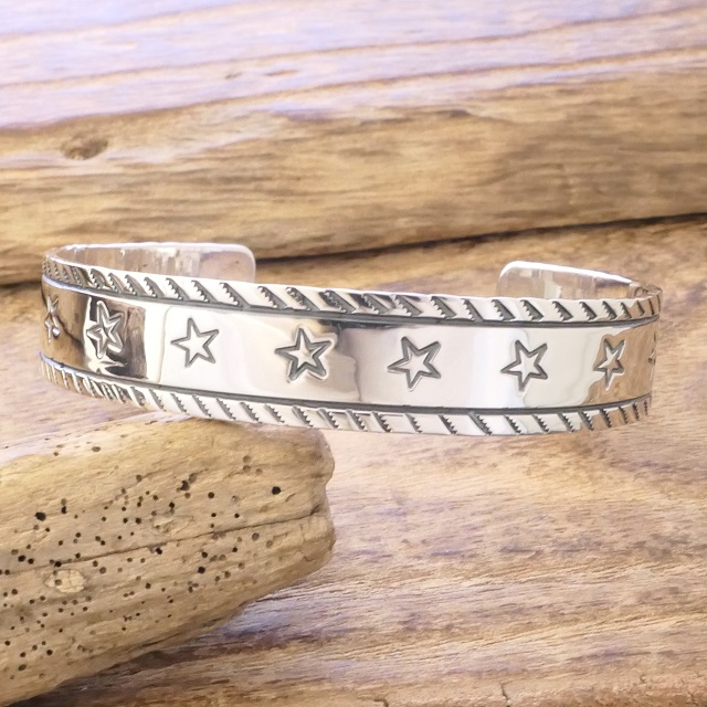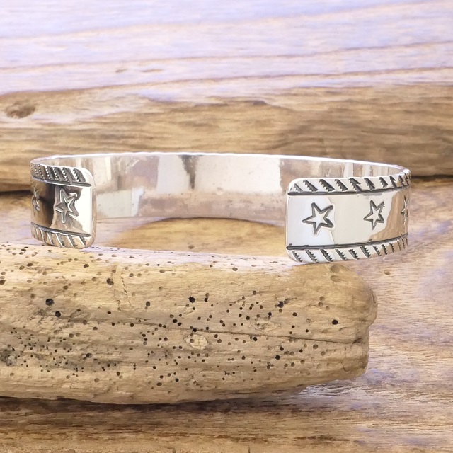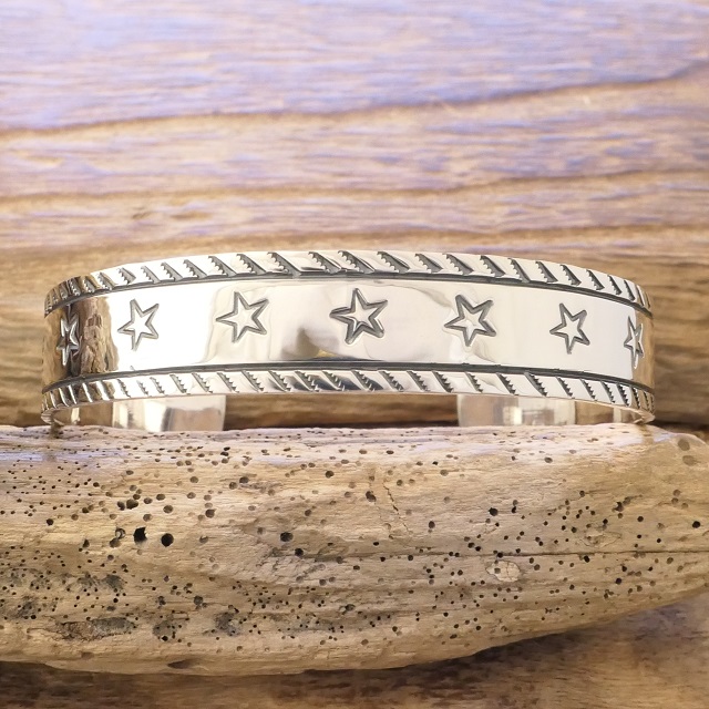古い作品に多く見られるトラディッショナルなチゼルワーク(縁取りのライン)にスタースタンプを施したバングル。