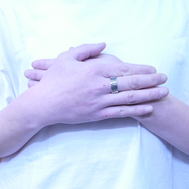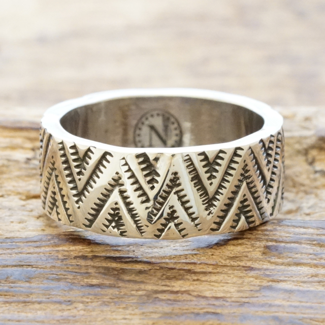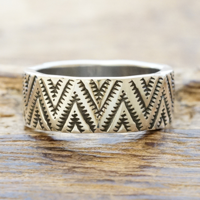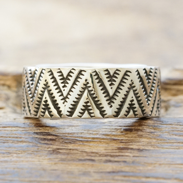古いナバホラグなどにも見られるトライアングルウエーブモチーフのスタンプワークを施したリング。