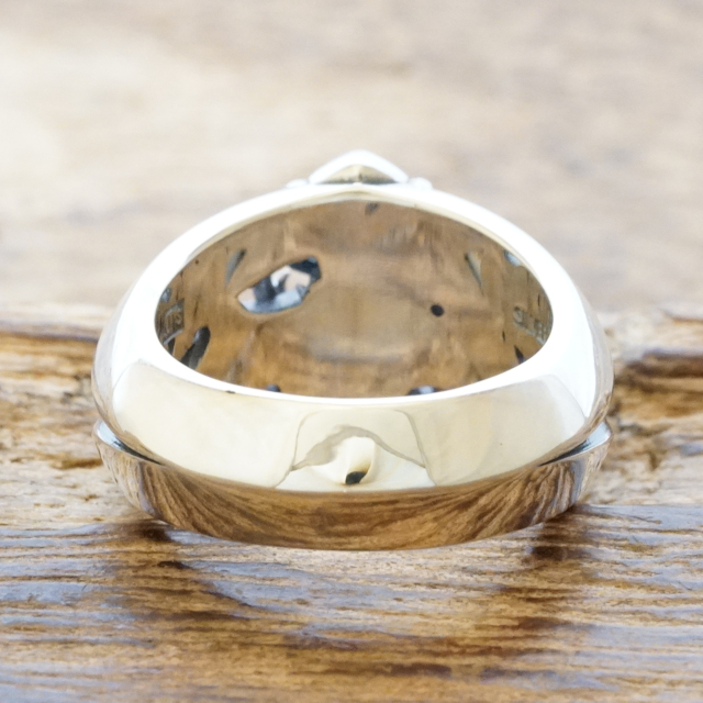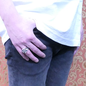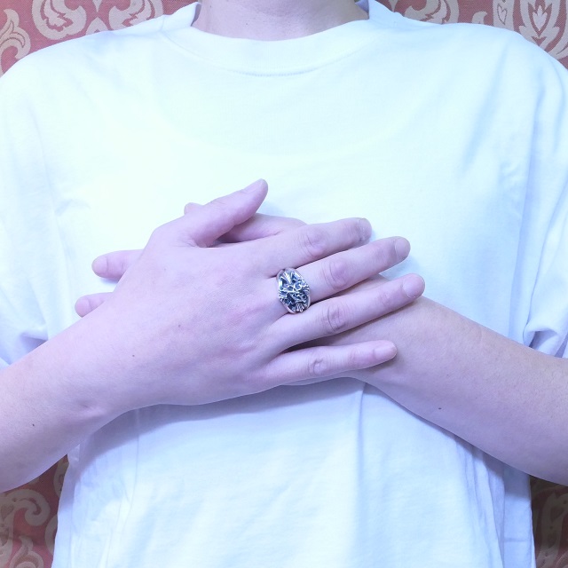 鋭角的なフォルムが美しく、緻密かつ繊細な曲線に磨きこまれたシルバーと燻しのコントラストが存在感のある指元を演出してくれます。