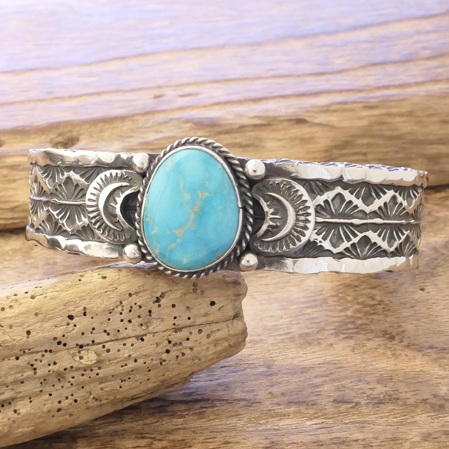 巨匠ゲーリーリーブスの2歳下の弟で、数々の受賞、優勝歴があるナバホのトップジュエラー。重厚なシルバーを使った巧妙なスタンプワークが特徴で、兄のゲーリーは裏まで届きそうな深いスタンプワーク、ワイルド&オールドですが、サンシャインは繊細でずれの少ない正確なスタンプワークです。ジュエリーだけではなく、シードポットや小箱などの立体作品も得意としています。