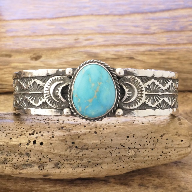 澄んだ水面を思わせるウォーターウェブが滲むキングマンターコイズに力強さと繊細かつ緻密さを掛け持ちあわせた奥深い巧みなスタンプが存在感のある腕周りを演出してくれます。