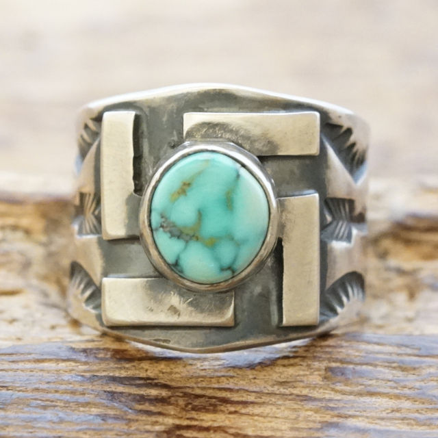 スワスティカの中央にはブルームーンターコイズがセットされ、サイドにスタンプが打ち込まれています。