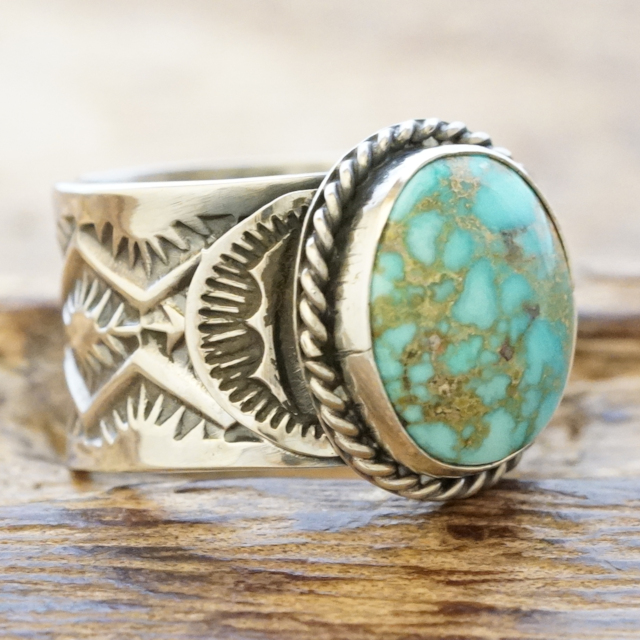 巨匠ゲーリーリーブスの2歳下の弟で、数々の受賞、優勝歴があるナバホのトップジュエラー。重厚なシルバーを使った巧妙なスタンプワークが特徴で、兄のゲーリーは裏まで届きそうな深いスタンプワーク、ワイルド&オールドですが、サンシャインは繊細でずれの少ない正確なスタンプワークです。ジュエリーだけではなく、シードポットや小箱などの立体作品も得意としています。