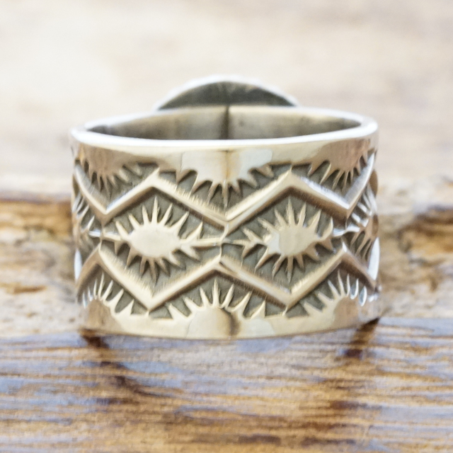 銀板に“たがね”を打ち付けて模様を刻んでいくスタンプワーク技法にアップリケを施しキングマンをセットしたリング。