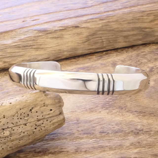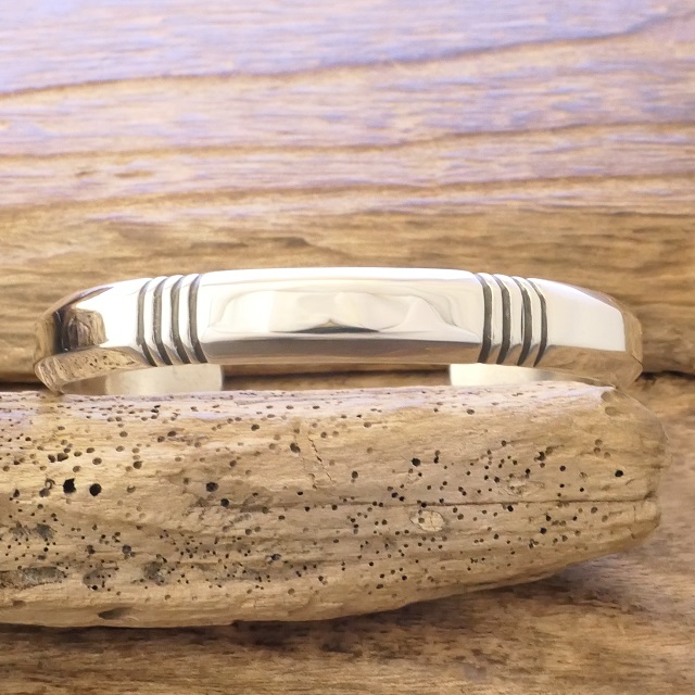 鍛造銀特有の内側から輝くような滑らかさに美しく並ぶスタンプの対比が存在感ある腕周りを演出してくれます。
