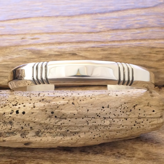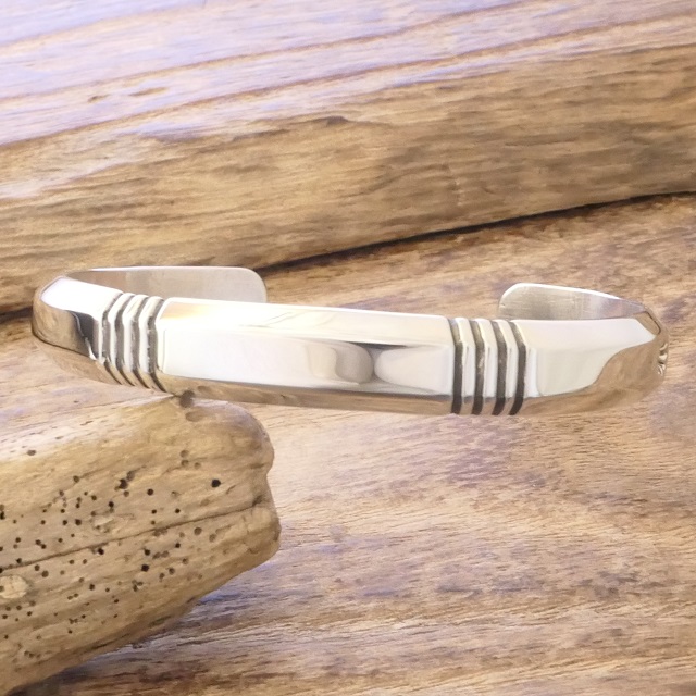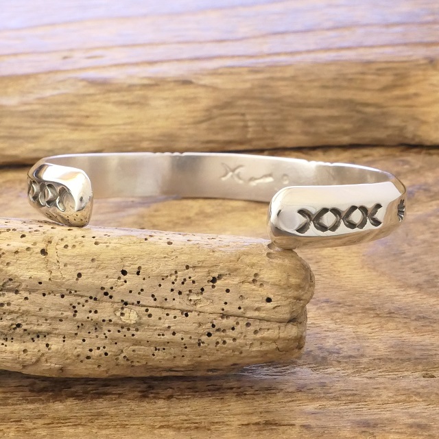 鍛造銀特有の内側から輝くような滑らかさに美しく並ぶスタンプの対比が存在感ある腕周りを演出してくれます。