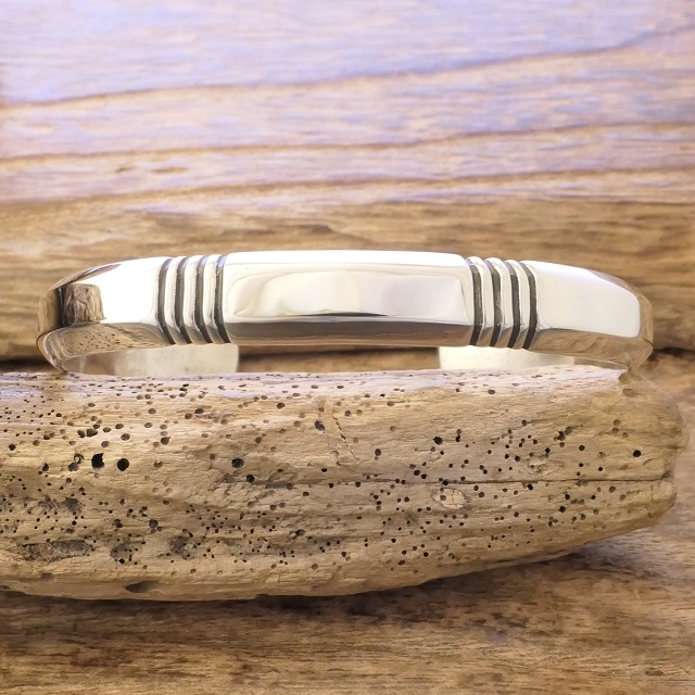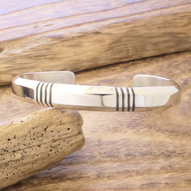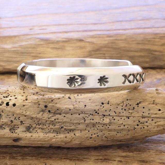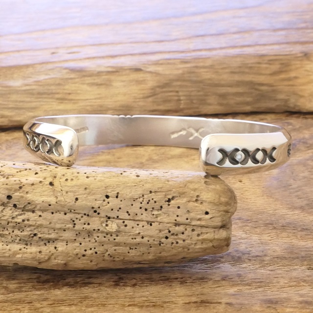 鍛造銀特有の内側から輝くような滑らかさに美しく並ぶスタンプの対比が存在感ある腕周りを演出してくれます。