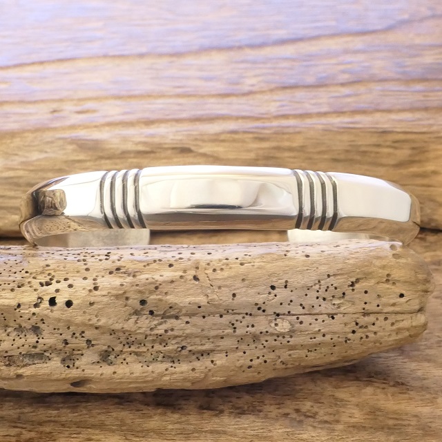 鍛造銀特有の内側から輝くような滑らかさに美しく並ぶスタンプの対比が存在感ある腕周りを演出してくれます。