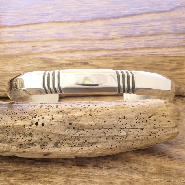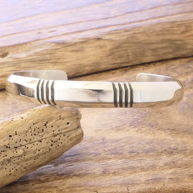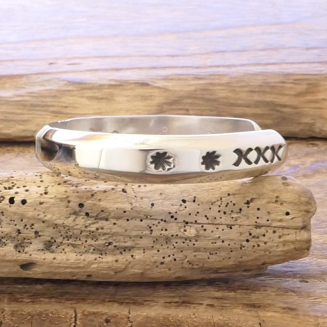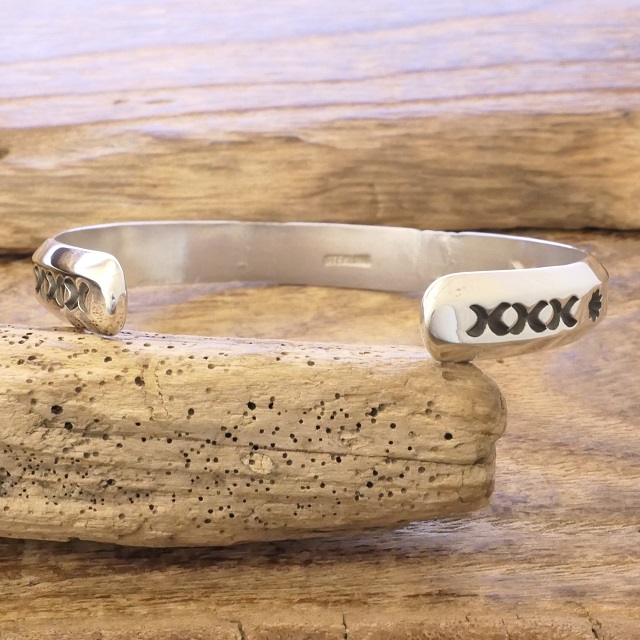 鍛造銀特有の内側から輝くような滑らかさに美しく並ぶスタンプの対比が存在感ある腕周りを演出してくれます。