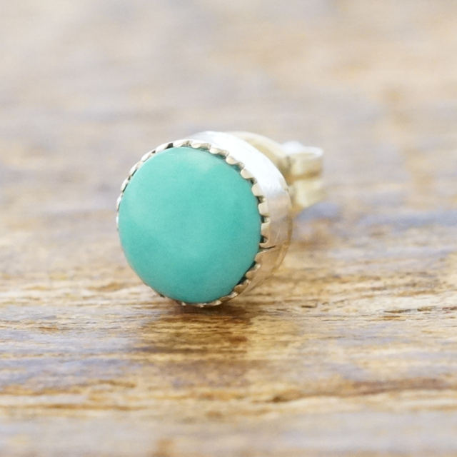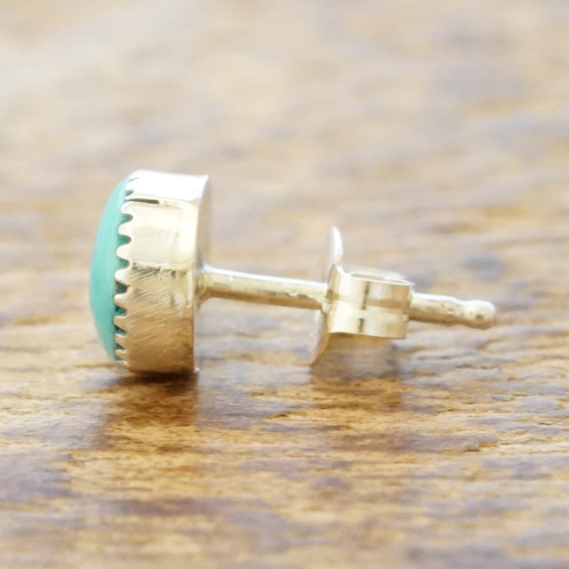 シンプルな石枠に、遠くから見たときに横たわった女性の横顔に見えることから童話『眠れる森の美女』の名が付けられたという世界的に有名なスリーピングビューティーターコイズを使用したスタッドピアス。